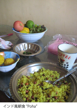 2/5,ベンガル寅のようになってしまったアシャがにこりともせず、超無口のまま朝食を作ってくれた。息子の上司に頼まれた客だから仕方ないが忌々しい厄介者め、とでも思っているのだろうか?メニューはインド風ブレックファスト「Poha」。ひよこ豆を大量の油で炒めて平たくつぶした米を入れたもの。これプラス昨夜のだんごが出てきた。