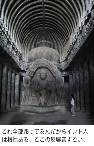 エローラで一番すごかったのは、その反響音である。人がいなくなった隙に、歌を歌ったり、あーとかうーとか、それだけでも気持ちがよい。自称ガイドがいたるところに居たのだが、そのうちの1人がそれらしいマントラを歌ってくれて、そのあまりの響きに鳥肌がたった。かつて、ここで集団生活をしていたインド人仏教徒が聴いたであろう響きを思うと、うらやましくてならなかった。