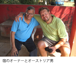 バスを降りてネカフェでリサーチした1泊300ルピーの宿へ行くが、アメドラに出てきそうなリゾートホテルであった。一泊1000ルピー。2000円だと!!高い!!もっと安い宿を紹介してくれと頼み、従業員とスクーターを2ケツでアンジュナビーチすぐそばのゲストハウス・シープリンセスに。一泊500と言うのでアホ!高いわ!とごねたら400ルピーにディスカウント。それでも高い。が、その頃はもうどうでもよい気分になってしまった。