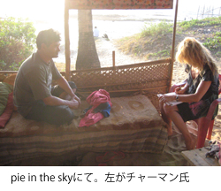 マナリの農夫に店を教えられる もう慣れたもので適当に話を合わせつつ、それでも真剣にカニの行方を考えていたら、今度はインド人旅行者のオヤジ:チャーマン氏が来た。いつものインディアン・ナンパである。インド北部山岳地方マナリでリンゴ農家をしてて作業の無い夏に毎年ゴアで遊ぶ独身貴族だそうだ。