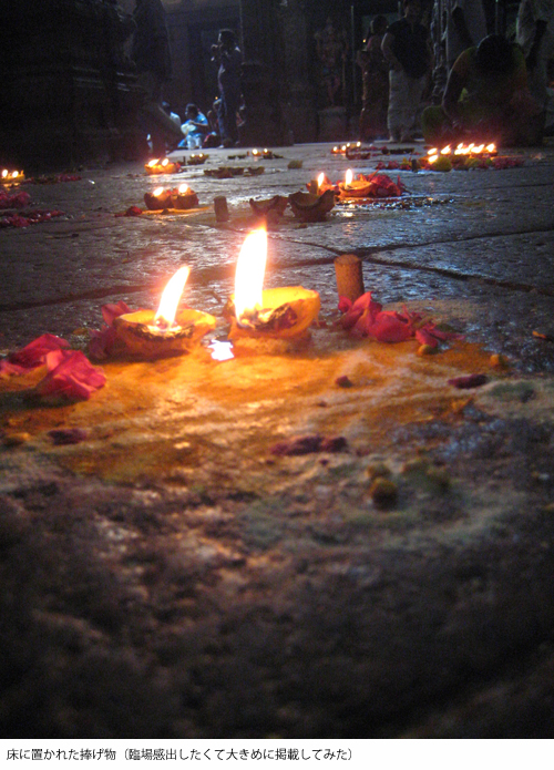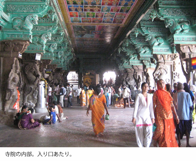 他にも、とある場所の柱をコインで叩くと良い音がすると教えてもらって、実際に叩いてみたりした。石とは思えない澄んだ金属的な音がした。どんな意味があるのか分からないなりに素敵な気分だった。漫画のような絵物語を延々見たり、ミーナークシー様のブロマイドを選んだり、スイートライス10ルピーを食べたり。ライスはバナナの皮に包まれてて、味はココナッツミルクとサトウキビで煮込んだ感じの優しい甘さで美味しかった。 人々が一心に祈りを捧げる場所には良い緊張感とムードがあり、やっぱりとても楽しい。