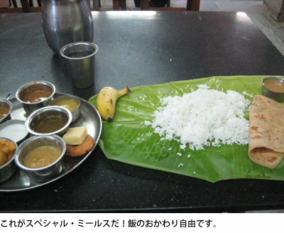 そこの屋台に、青マンゴーの切り身マサラパウダーがけがあった。非常に美味。まさかこの20円ばかりの切れ端が、ゴアのフィッシュカレー、クンバーコーナムのミールスに並ぶ、今回の旅3大美味の一つとなるとは。爽やかな青い香りとほどよい塩&スパイス。たくさん食べられる味ではないが、忘れ難い味である。あと、Mamalla Bhavanという1959年から営業している食堂で特別定食をたべる。何となく古い大学みたいな雰囲気だった。