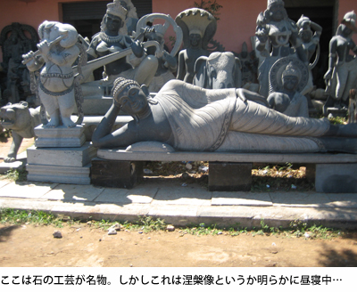 震災で動揺する旅人 田舎なので夜空は一層黒い。サンダルでとぼとぼ歩くと下弦の月がついてきた。中心部についたら牛、牛、牛のオンパレードで、もうほとんど牛小屋のようだった。街の人達は旅行者慣れしていて、見るからに日本人の私に、心配そうな顔でSTUNAMIがどうのとか、家族は無事かい? とか話しかけてくる。今思えば2004年スマトラ沖地震による津波でインド・タミルナードゥでも多くの犠牲者が出ていたので、他人事とは思えなかったのだろう。驚くほど道々で哀悼の意を表された。