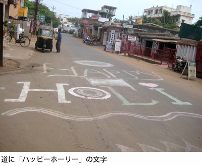 例えば、デリーなどの大都会でホーリーにでくわすと、痴漢や怪我の危険があると聞いていたが、プリーのそれは比較的のんびりしていると言われたので、泊まっている数人といっしょに私も参加することにした。当日は全身汚れても構わない服を来て、用心のために日本人で固まって町を歩いた。