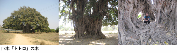 土産物屋のオヤジがスジャータの生まれたセーナー村までバイクで送ってくれた。途中、日本語のダジャレをとばしまくる楽しいオヤジ。まず、日本人の間で「トトロの木」と呼ばれる巨木をみて、