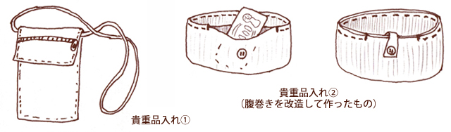 (使用したのはナイフのみ)、ミニ懐中電灯、 方位磁石、ミニハサミ、ソーイングセット、 小銭入れ、日記帳、お守り、安全ピン、腕時計、